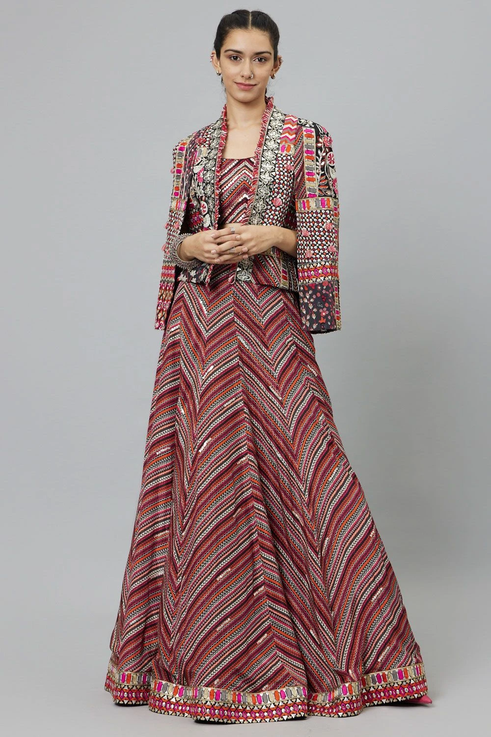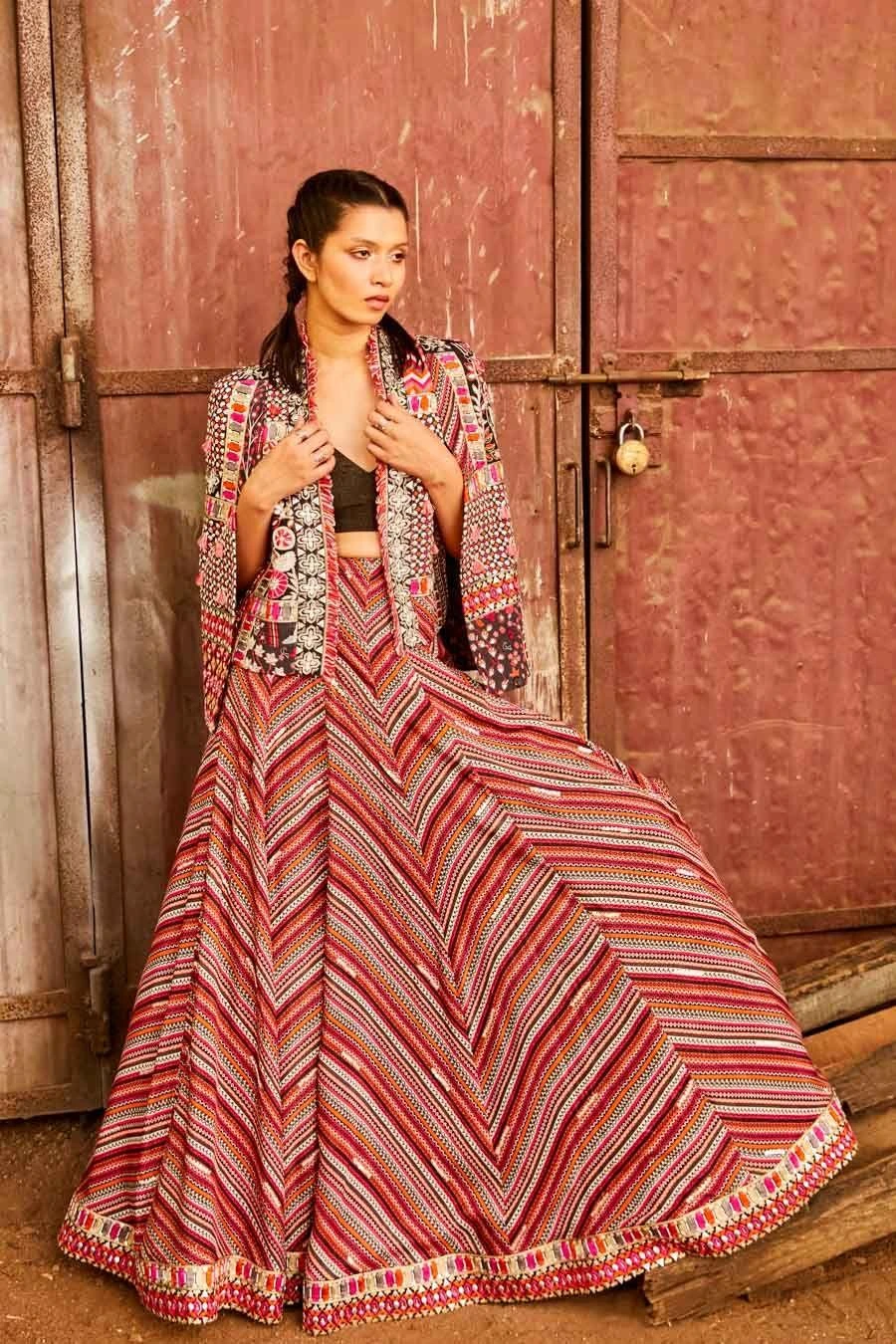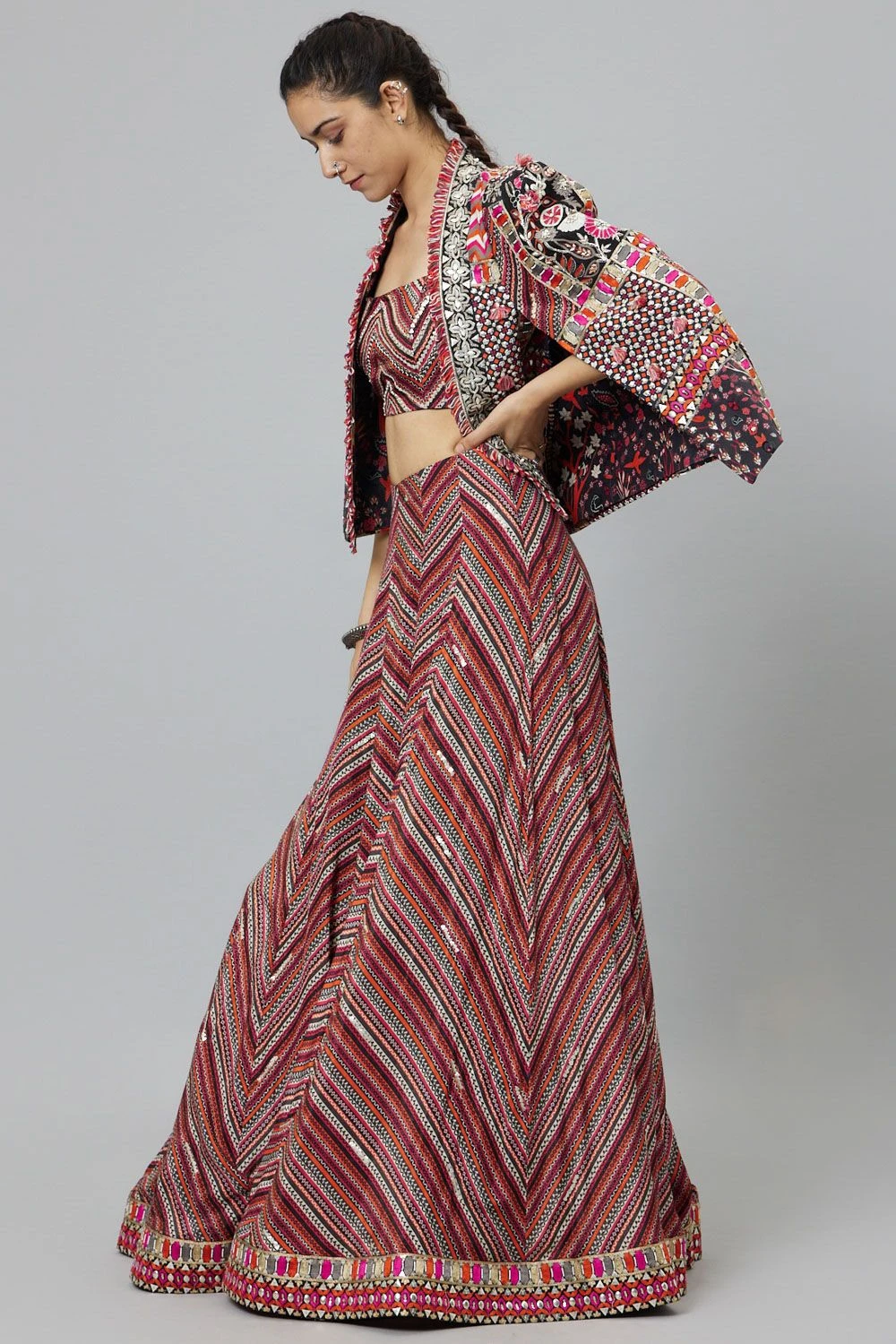 Immerse yourself in sophistication with this structured bohemian stripe cape jacket, paired flawlessly with a coordinating lehenga and a bustier. This ensemble emanates refined elegance and timeless charm.