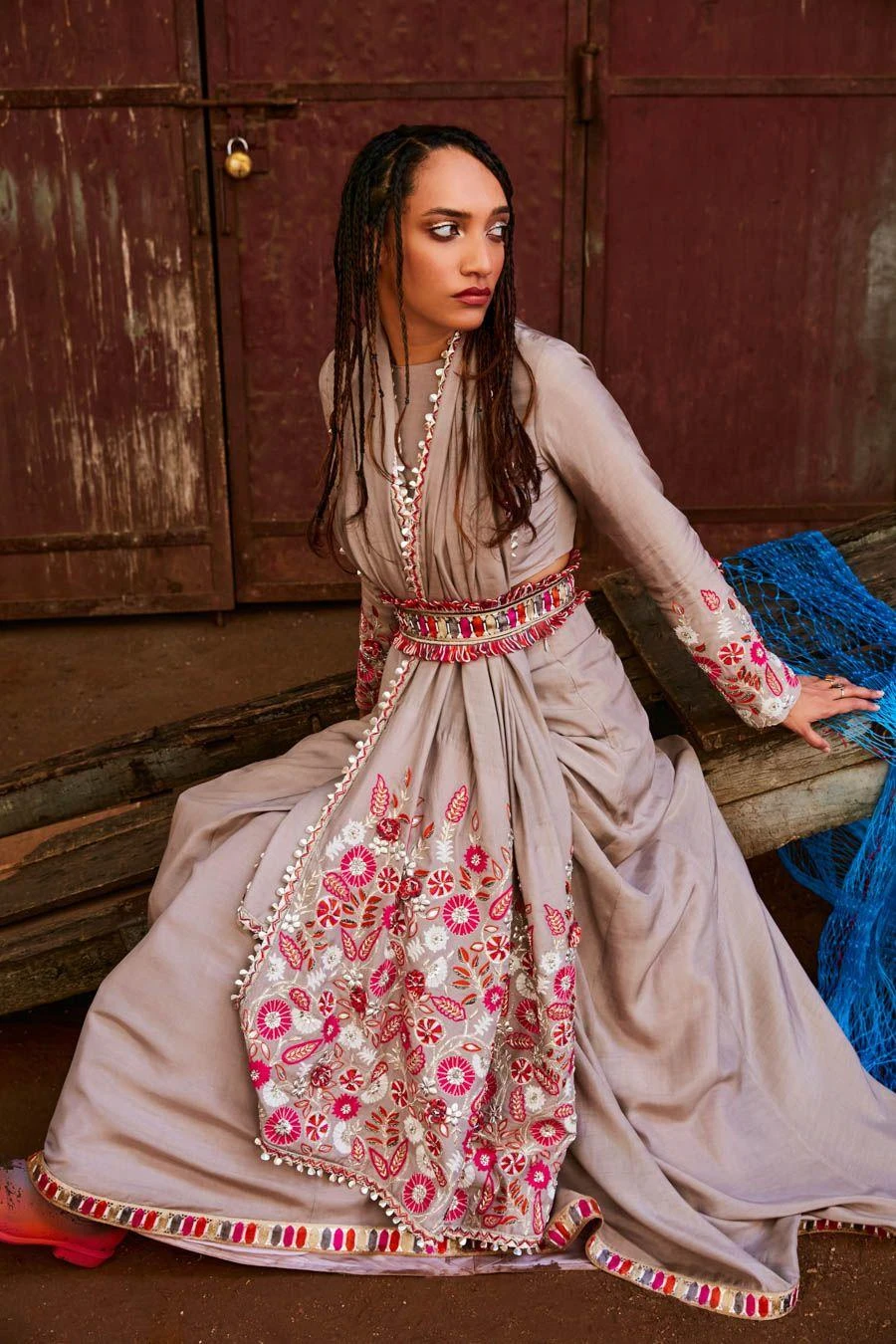 The perfect amalgamation of style & comfort, this lehenga set is perfect for a day out. Crafted in shimmer crepe, this set features a floral embellished lehenga paired with a coordinating blouse & an attached drape.