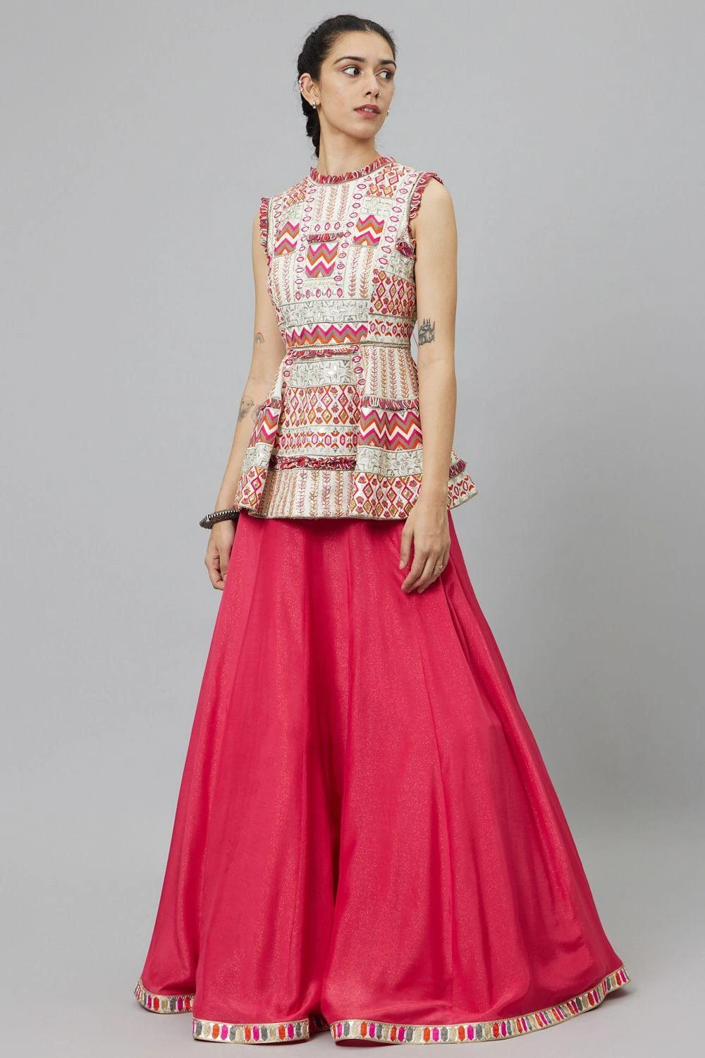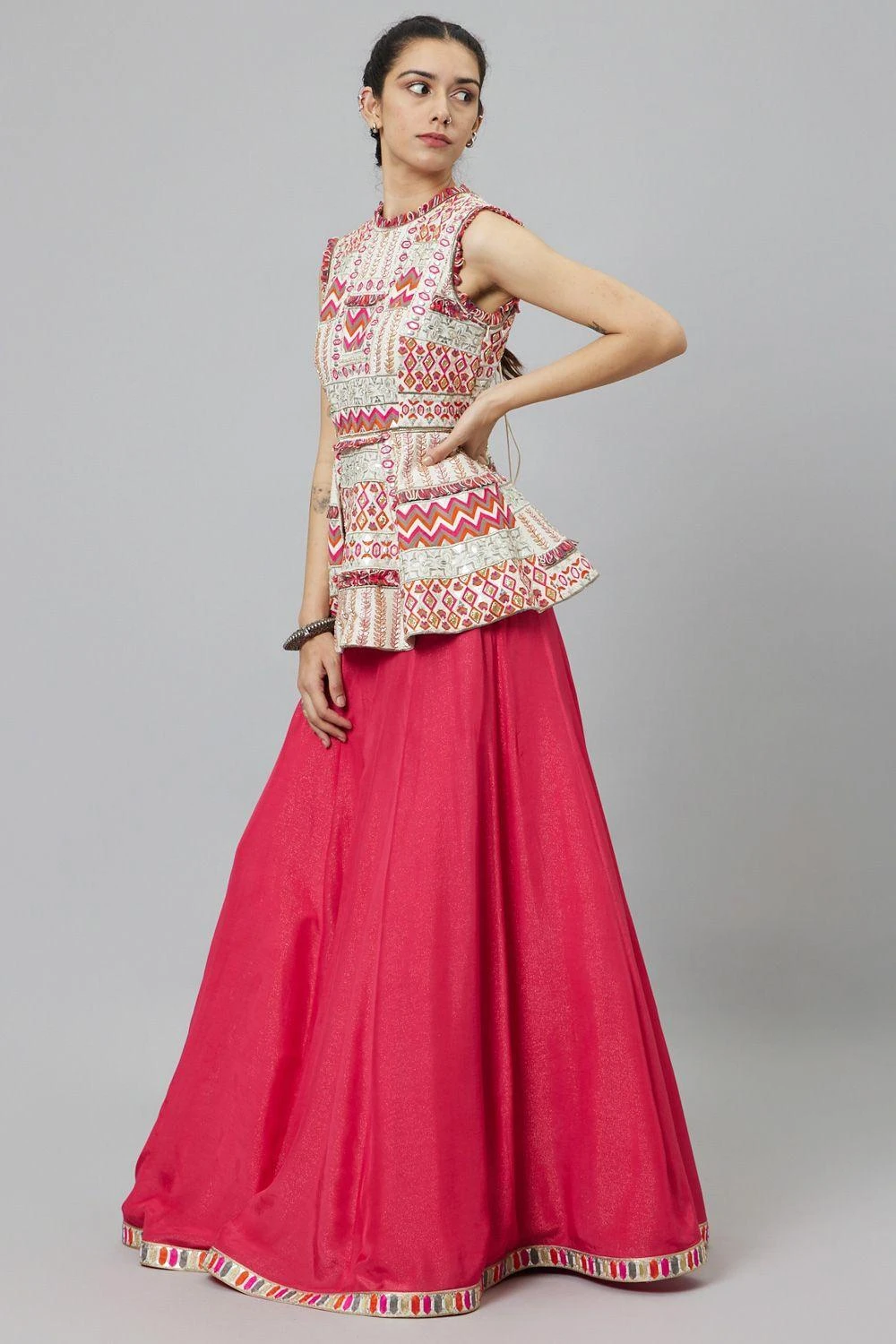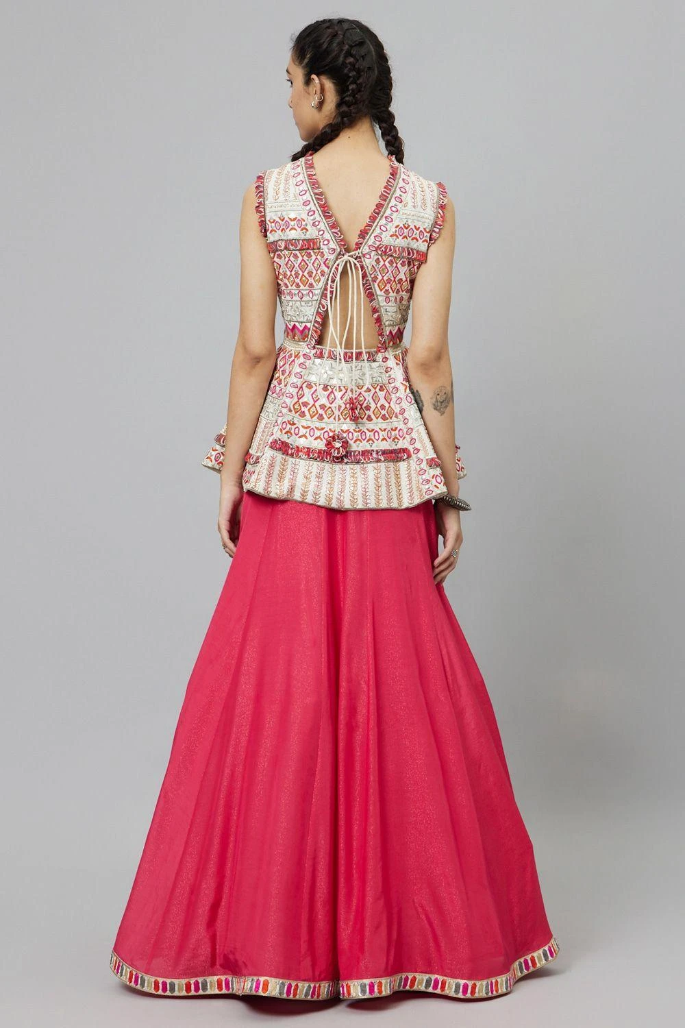 Elevate your elegance with this Ivory Embellished Peplum, beautifully harmonized with the charm of a Pink Lehenga. A perfect union of opulence and grace, embracing sophistication in every intricate detail.