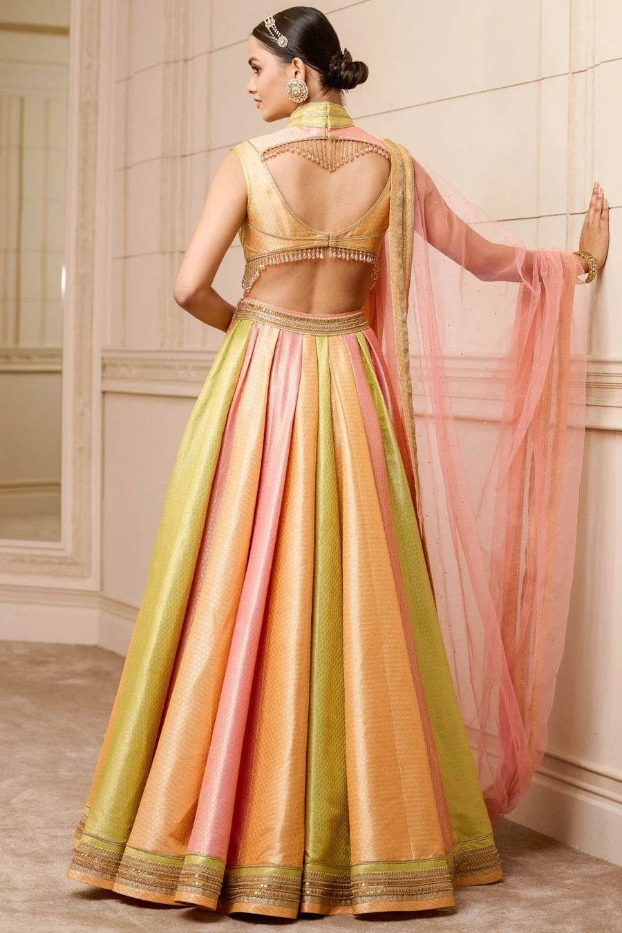 This multicolour kalidar lehenga in brocade is paired with a panelled brocade blouse embellished with crystal fringes & a tulle dupatta laced with brocade borders and encrusted with crystals. Add a pair of statement earrings to complete the look.