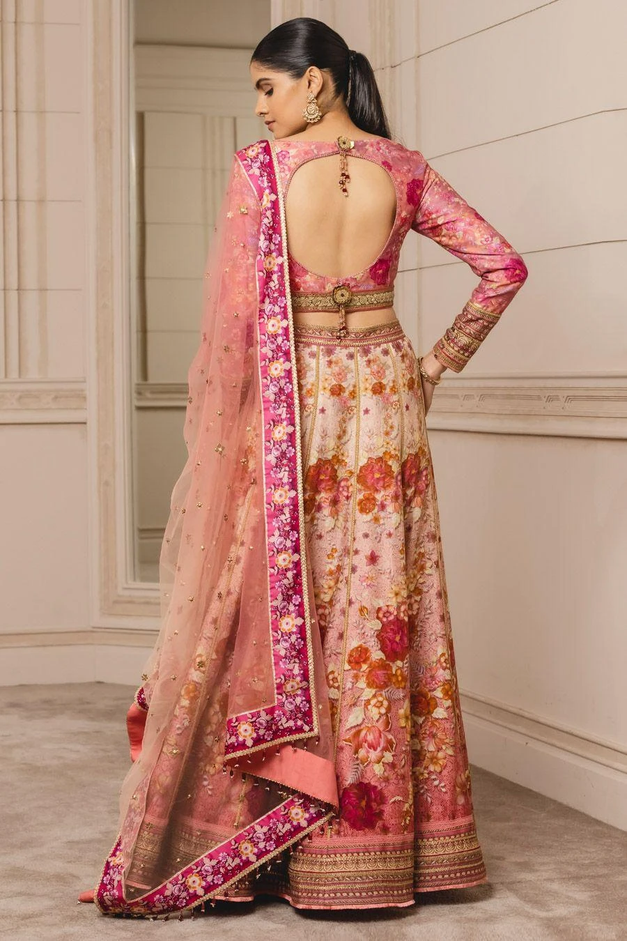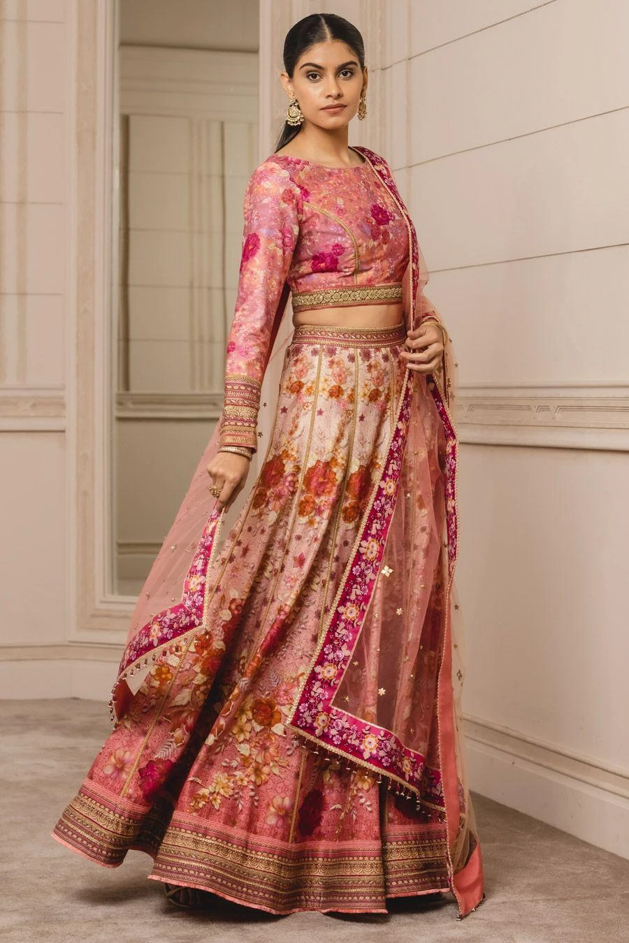 Look effortlessly stylish in this pink lehenga set. Crafted in taffeta, this set features a floral printed lehenga paired with an equally versatile blouse and a dupatta. Add a pair of statement earrings & a potli bag to complete the look.