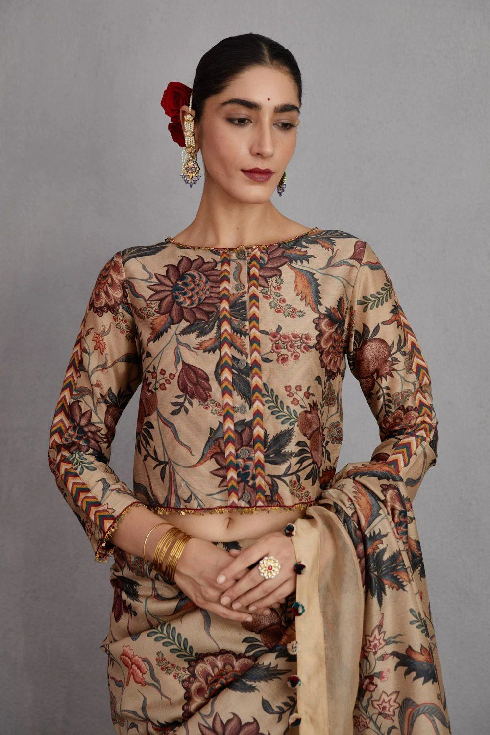 This natural beige printed blouse will perfectly complement your solid silk saris. It is woven in 100% cotton silk and features a front button placket.