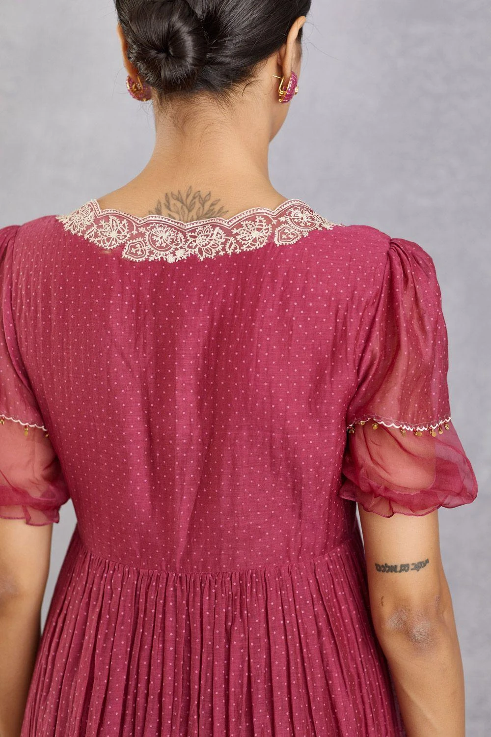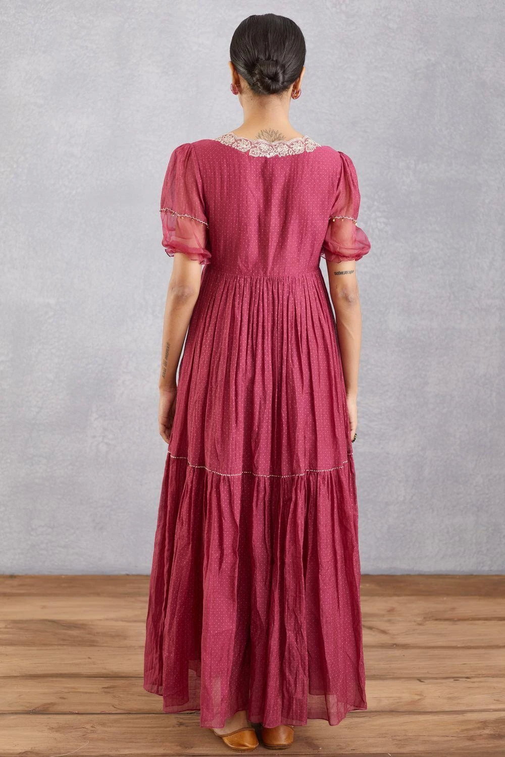 This ruby red maxi dress is all things flirty & feminine. It is cut in handwoven thin chanderi in a fit & flare tiered silhouette and enhanced with intricate embroidery on the neckline. Style it with a pair of statement earrings to complete the look.