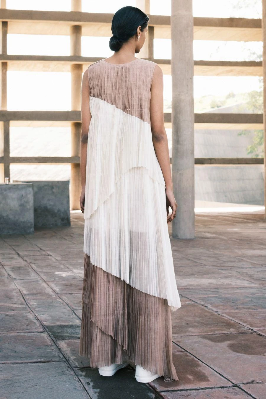 The Kawa dress features a mesmerizing colour-blocked pattern that is both daring and captivating. The knife pleats add a dynamic dimension to the dress, accentuating the wearer’s figure and creating a sense of movement and fluidity.