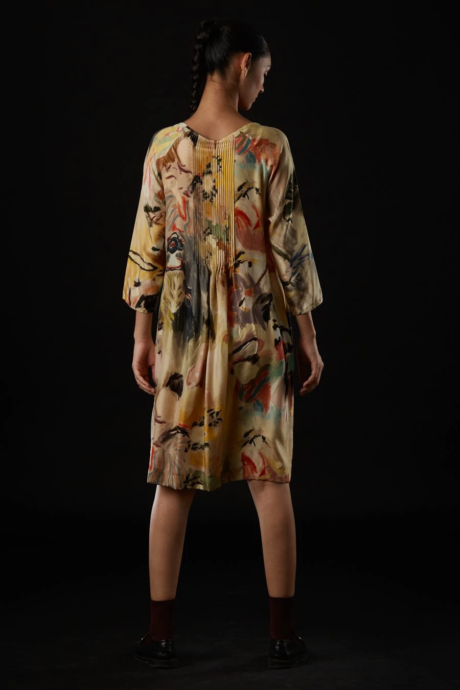 This beige dress is the quintessential example of luxe minimalism. Yavi’s classic dress with a crew neckline and pintuck detailing in the front is crafted in silk and features a collection of flamboyant strokes painted across a lovely Ecru.