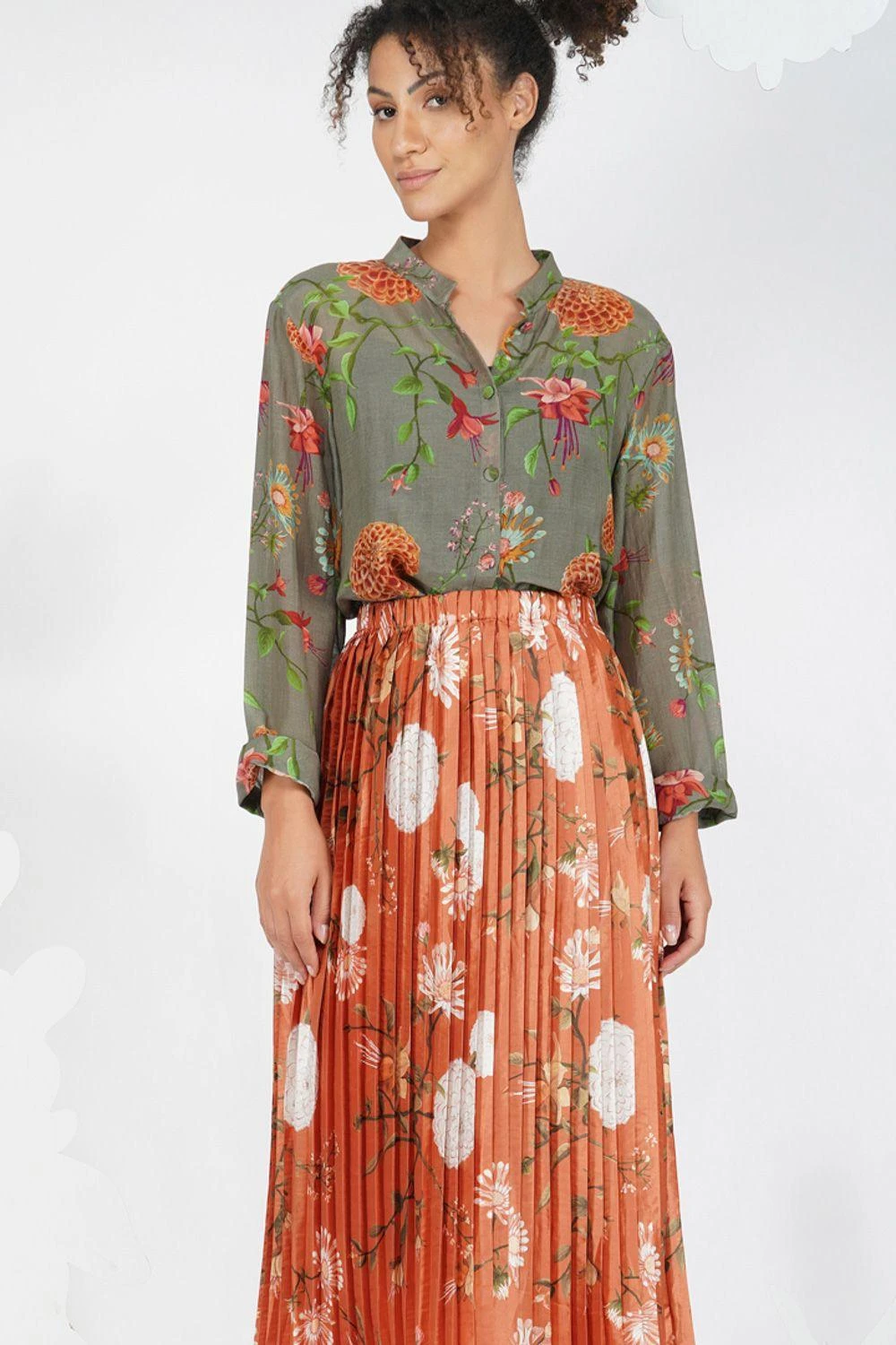 This pleated skirt is the perfect clothing piece that can be paired with anything for an instant dressy look. It is cut in polyester silk and printed in florals, lovingly painted by hand.
