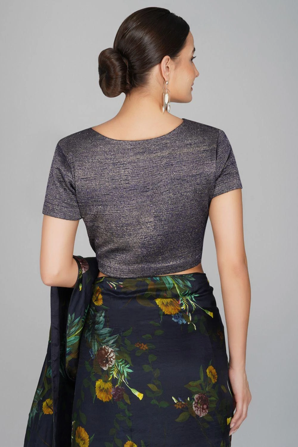 This charcoal grey shimmer blouse will add the perfect amount of bling & drama to your saris. It is cut in one thread embroidery.